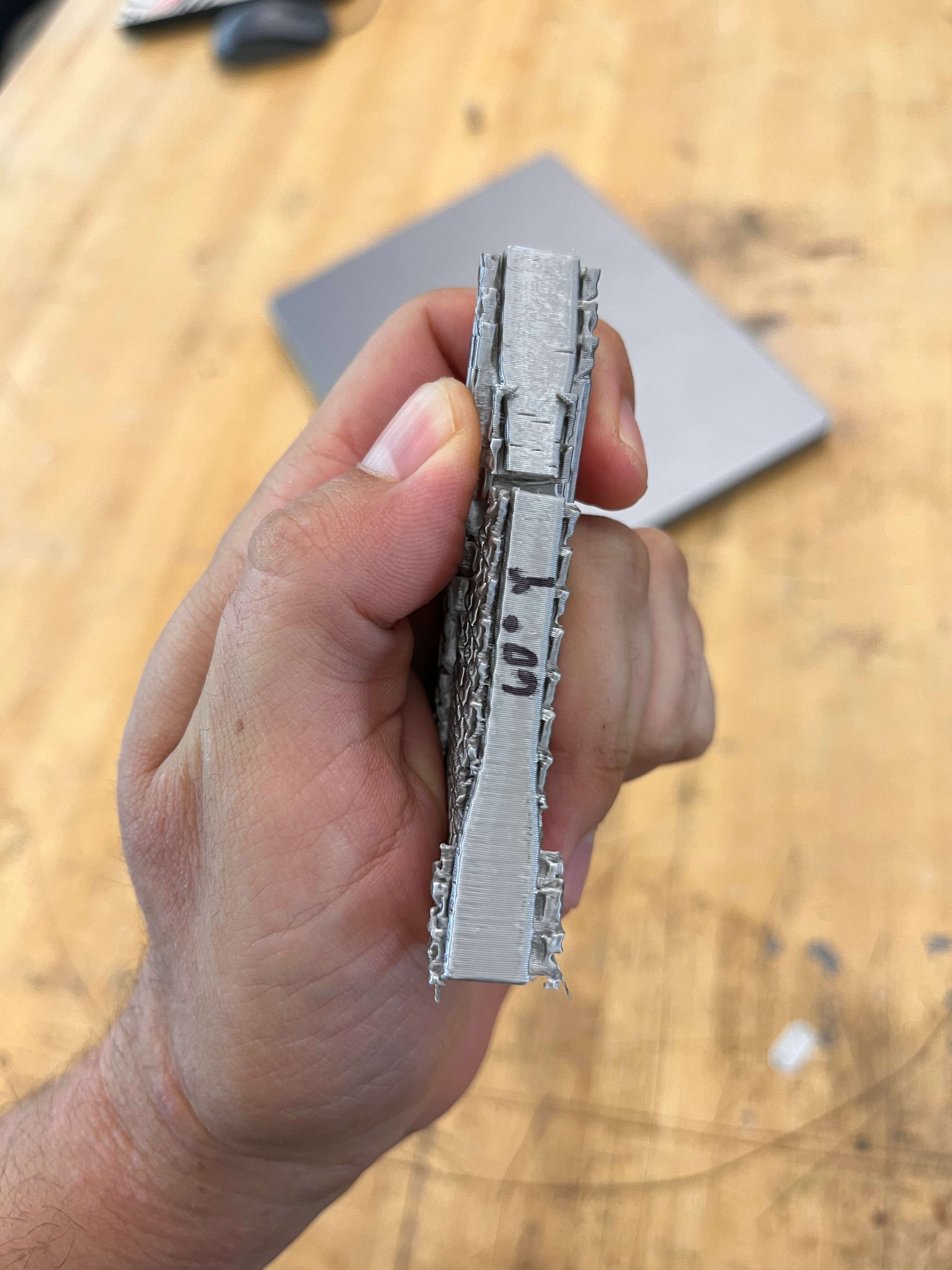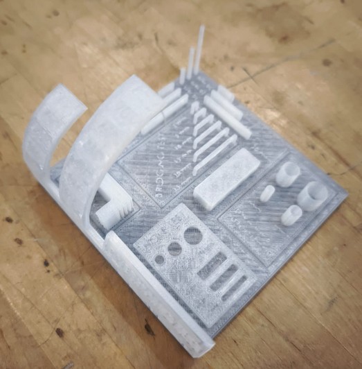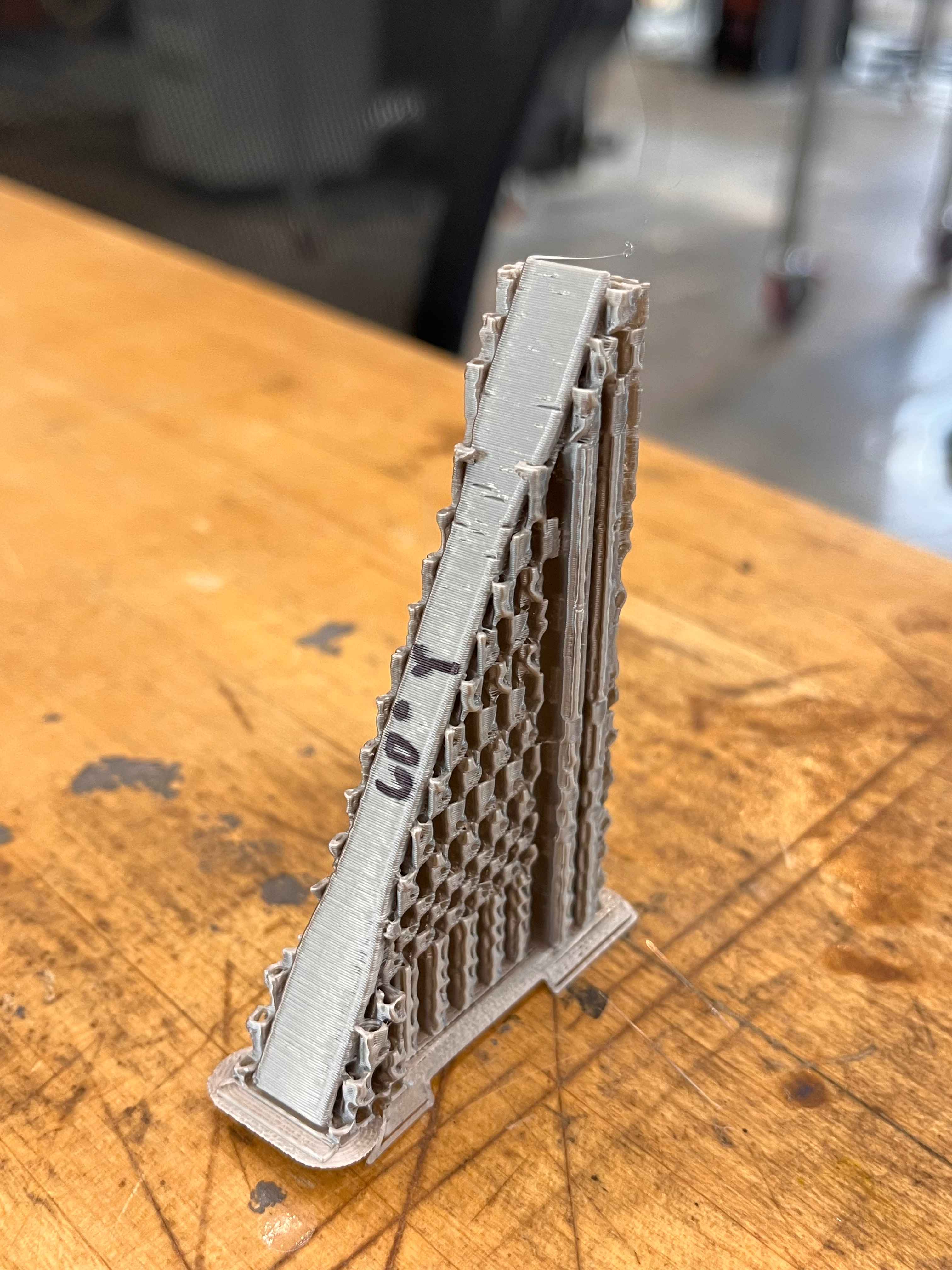 Ben created an initial overhang test model, but the team identified a more comprehensive alternative model for testing. To optimize print time and material usage, the print area was reduced by eliminating angles that had already been validated.
