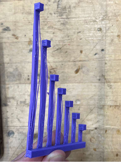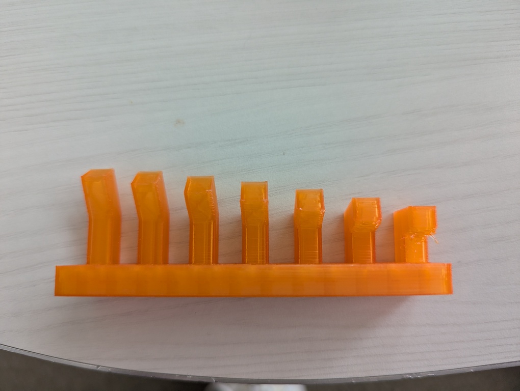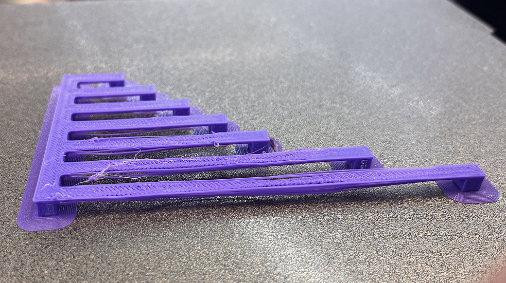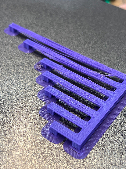 After re-exporting and double checking our settings (and the material used on the printer), we were able to run a successful print. The results generally reflect the advice we got in class that overhangs up to 30 degrees are doable without supports. In this particular print, we determined that an overhang of 20 degrees still looks ok, but that the print starts to degrade from there. The 10 degree overhang shows signs of sagging filament, the 0 degree overhang has disconnected filament threads, resulting in "spaghetti".