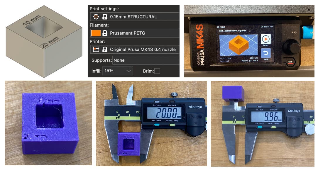 To test dimensions, Sara remade the example test block in Fusion since the original example was much too large. The file was then exported and prepared for printing in the PrusaSlicer with the following settings: 0.15mm structural, Prusament PETG, Original Prusa MK4S 0.4 nozzle, no supports, and 15% infill, resulting in a 16-minute print time. The numbers were unfortunately designed too small to read since they were smaller than the minimum dimensions producible by the 0.4mm nozzle. The measurement of the external 20mm diameter design was spot on at exactly 20.00mm, but the internal 10mm diameter was slightly off at 9.96mm. This indicates that the dimensional accuracy is pretty high but not perfect. This should be taken into account for future designs.