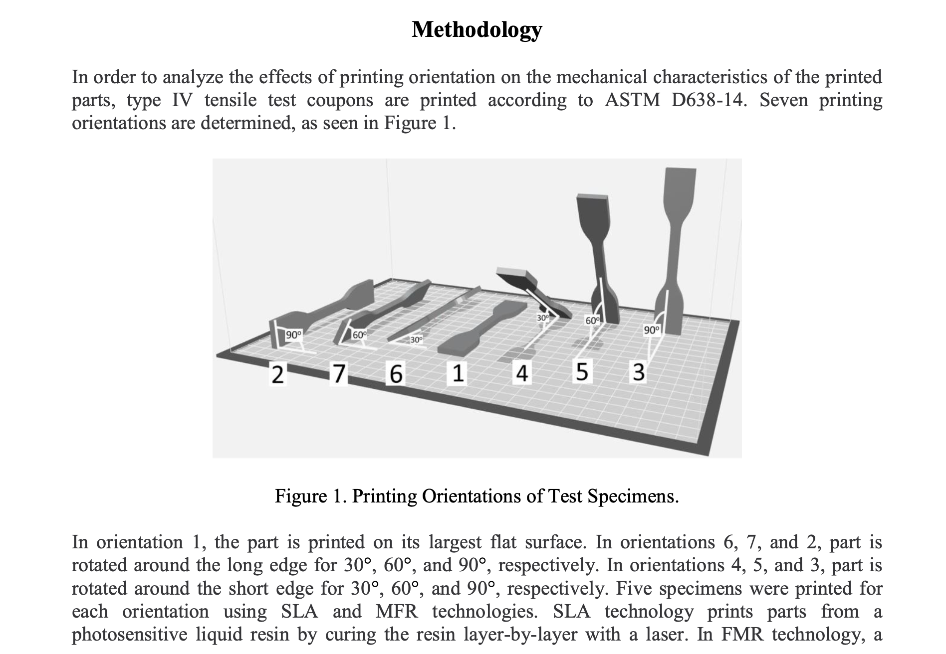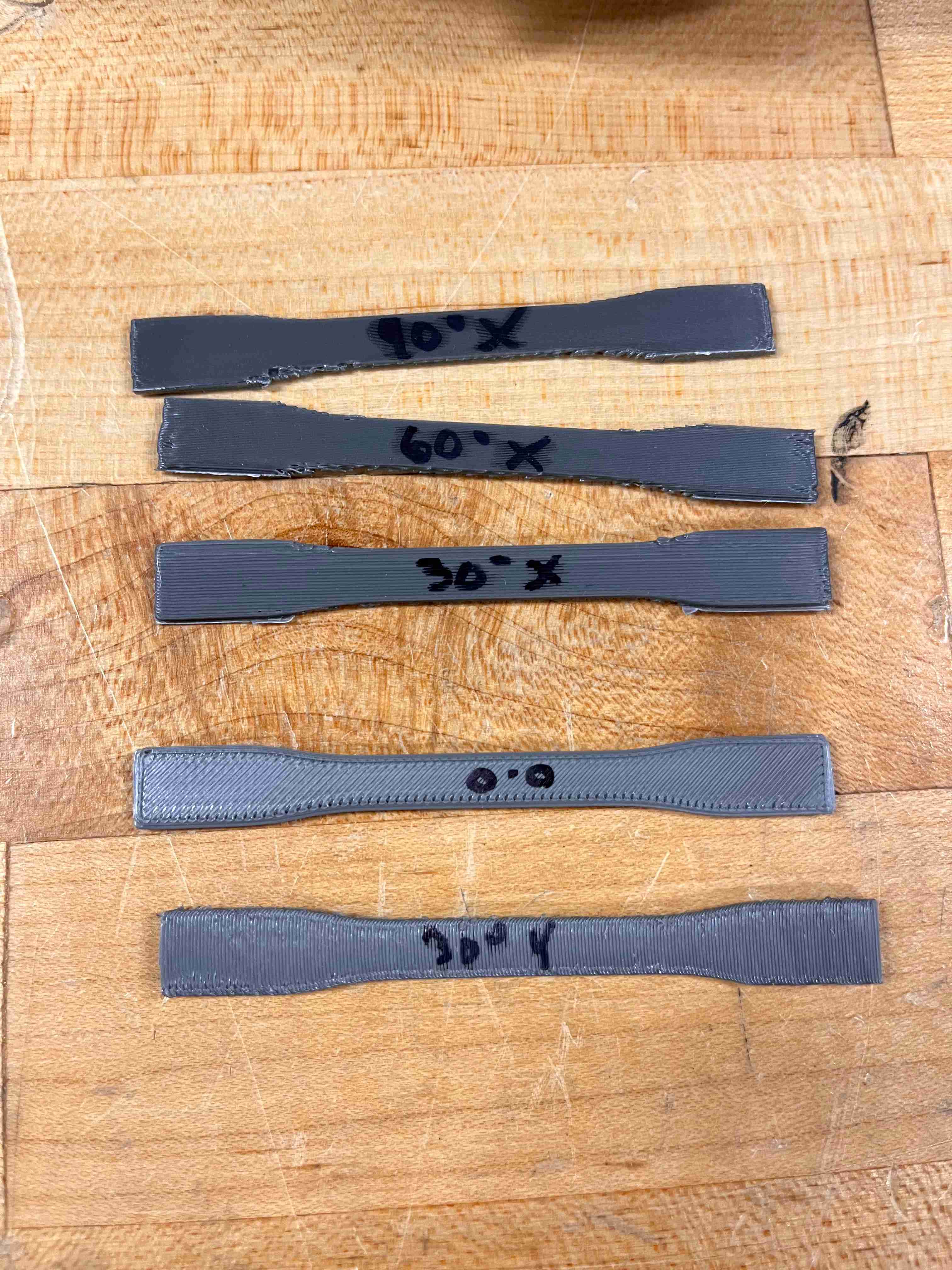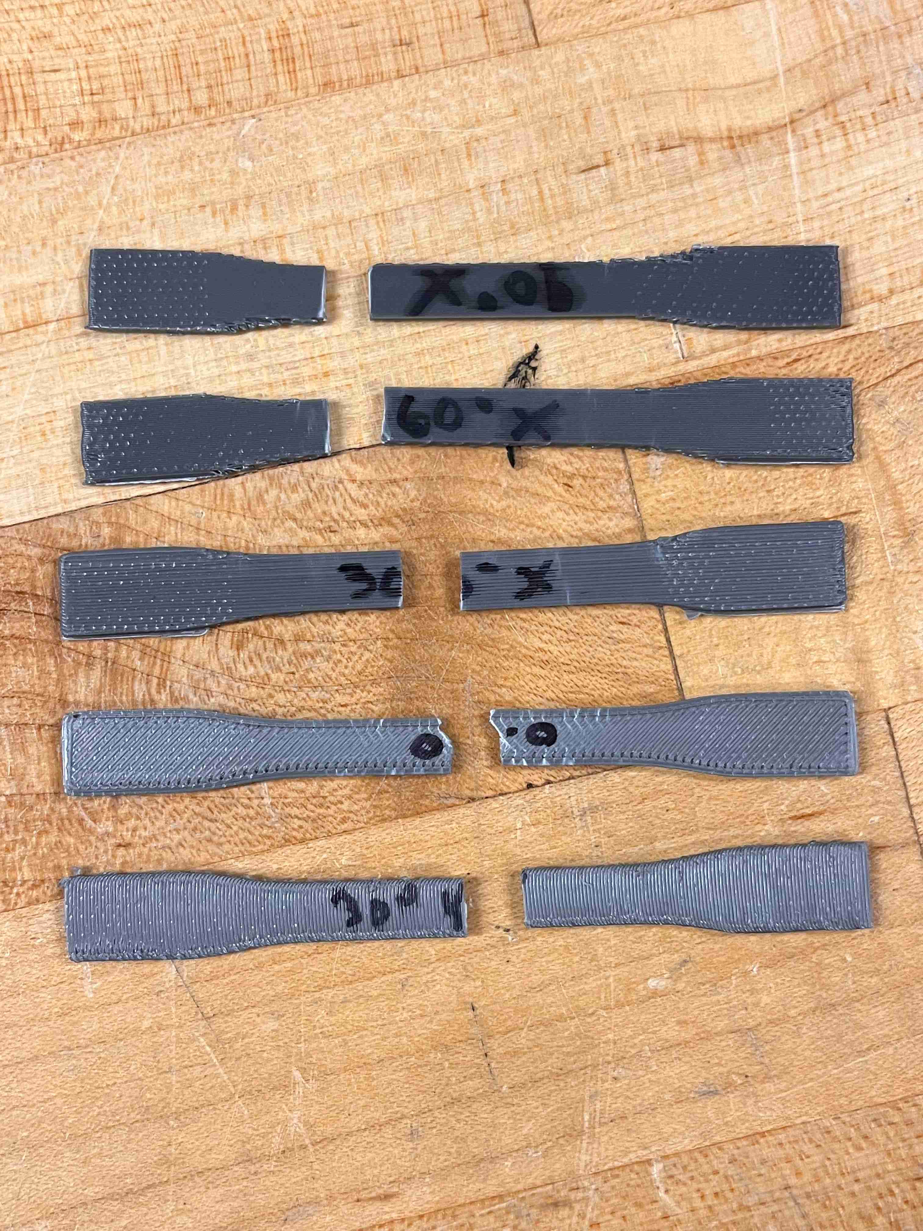 We wanted to conduct some additional anistropic testing, and see if there was any way to quantify how strong the different printing angles would be. I found the paper "Understanding the Anisotropic Characteristics of 3D Printed Parts" by Richard Joseph Williams Jr and Dr. Mehmet Emre Bahadir at Southeastern Louisiana University, which showed them using "dogbones" at different angles to conduct similar tests.