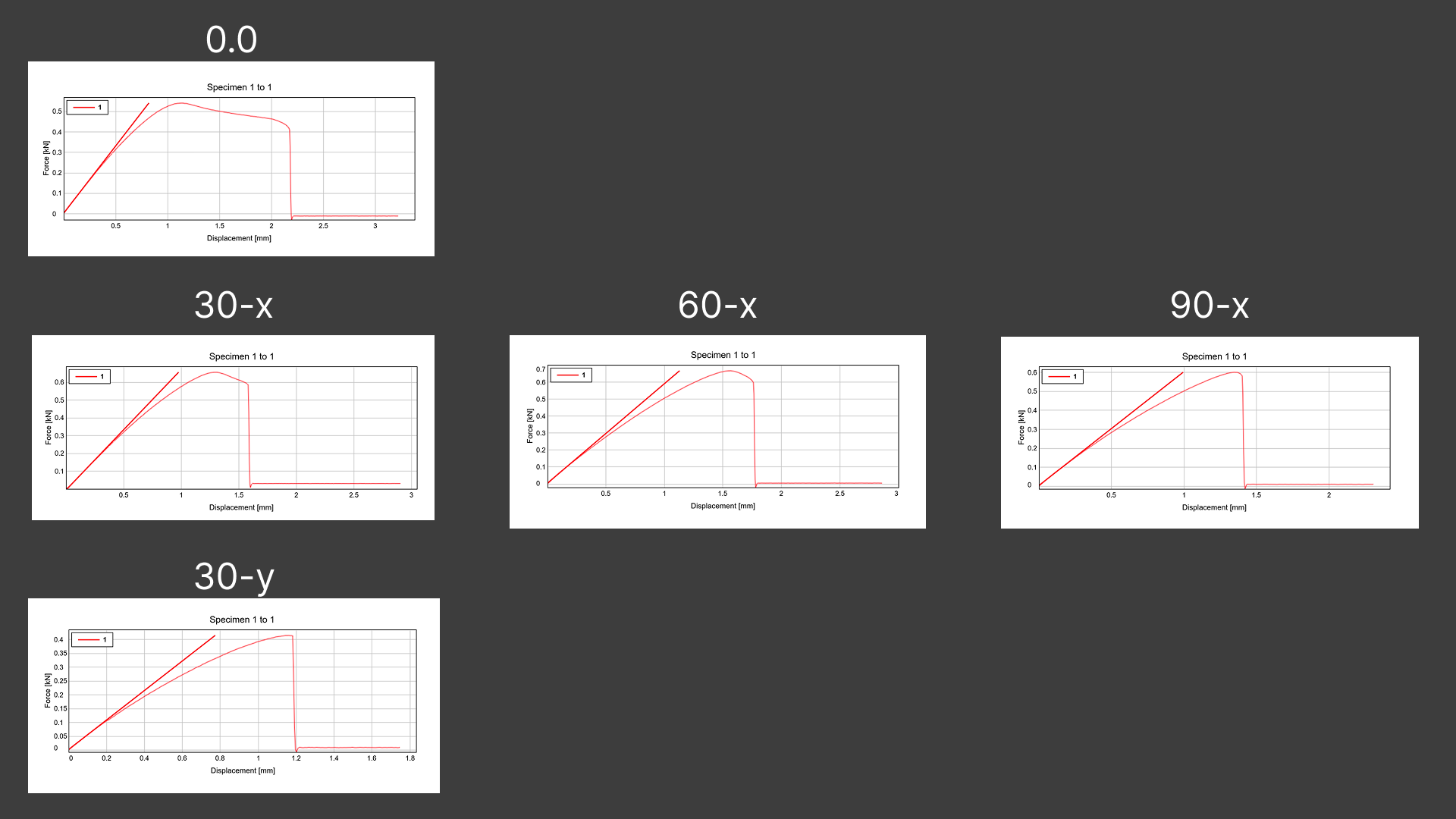 Somewhat to be expected, the control/0-degree rotation held out the longest, and experienced the most "stretch", so to speak – there was a longer period between peak force and the final snap. 30-y lasted the least by far, which was also somewhat to be expected given how the filaments are arranged and how the 60-y and 90-y dogbones fared in the original printing process, and also had the shortest period between peak force and the final snap – barely any "stretch" or deformation at all. It also seems like 60-x experienced the highest actual applied force, nearing 0.7 kN, even compared to the control/0-degree rotation.