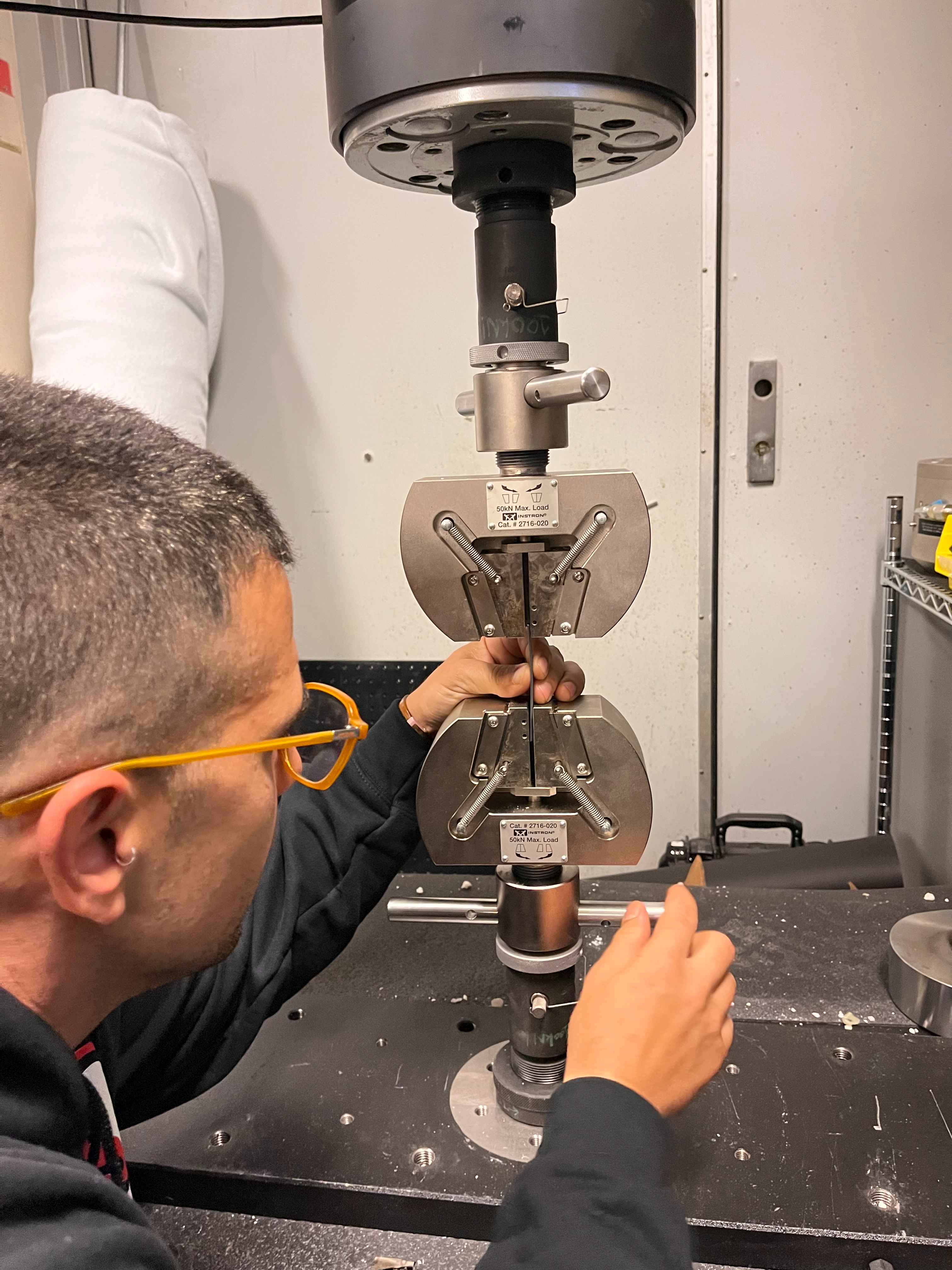 Now it was time to test! Alphonso brought us down to the CBA lab, where we used the Instron Tensile Tester to pull each dogbone apart. Here's the before and after: