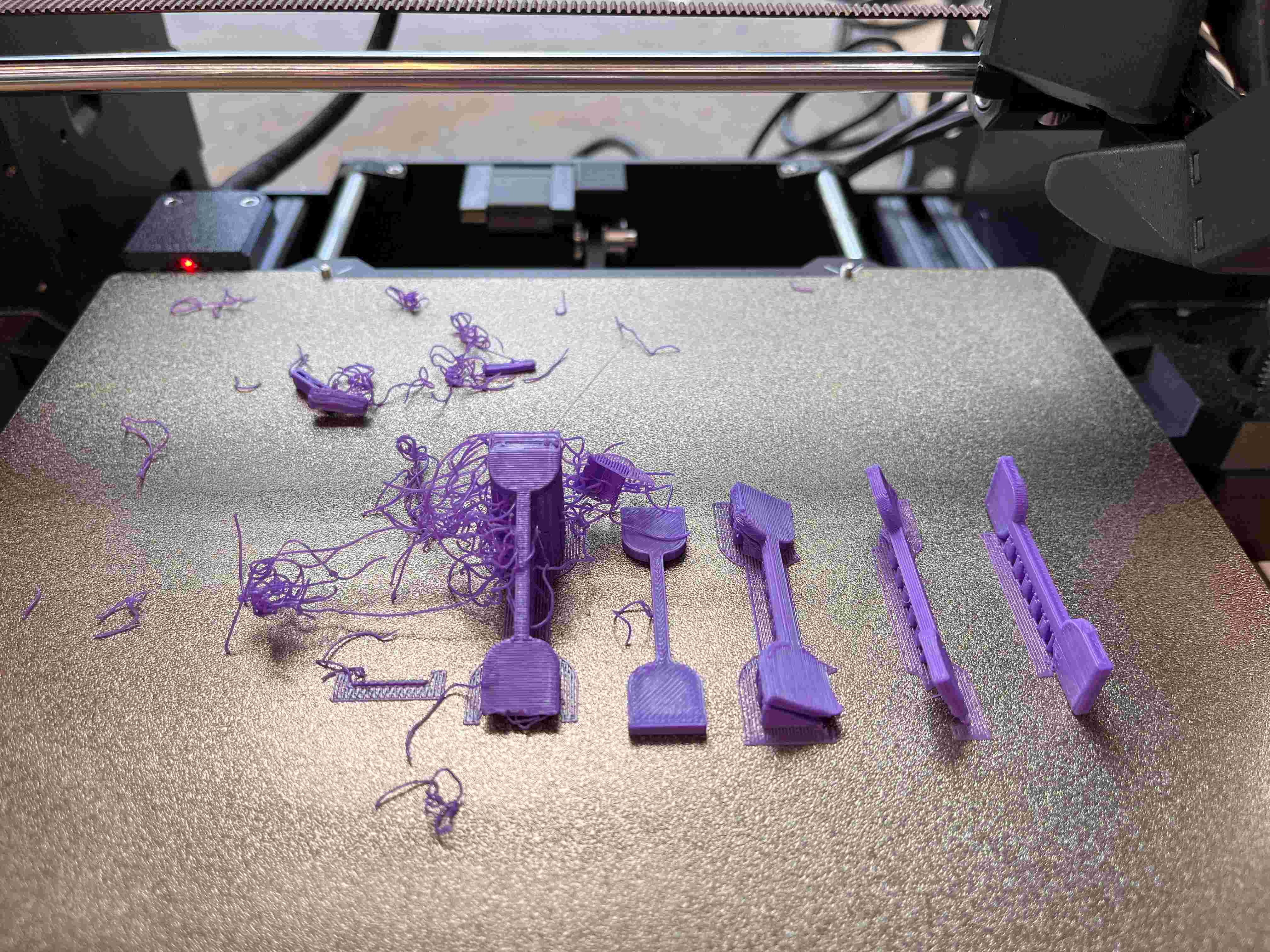 Here's a gallery of the printing process. After some tests, we decided that the 90-degree vertical print would definitely fail, so we'll leave that aside for a follow-up test. We found that even the 60-degree vertical print was having trouble, so we painted on supports, but it was so brittle that it broke multiple ways in the process of removing it from the supports. This happened multiple times, so we also left that aside for the time being. That leaves us with 0, 30-x, 60-x, 90x, and 30-y to test.
