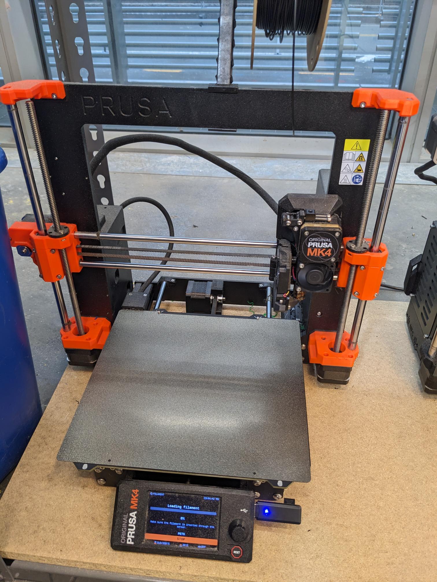 The team selected bgcode format over gcode for export based on what was already on the flash drive. Initial printing attempts failed due to inadequate base plate preheating. We had to run the machine’s built-in preheating routine. In the meantime, Yufeng demonstrated the filament loading procedure.