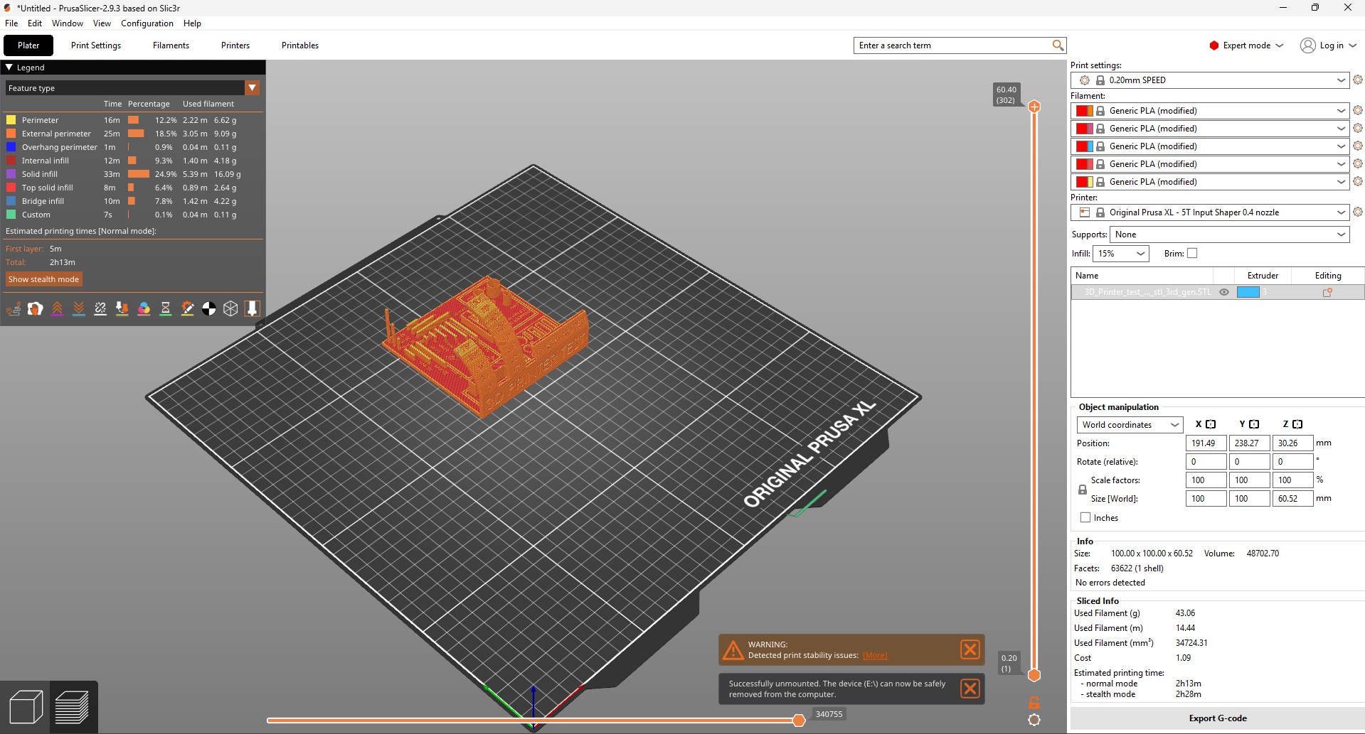 Then I printed this test print in the Prusa XL with 1.75 PLA to quickly go over several settings. The results are very similar to the MK4s.