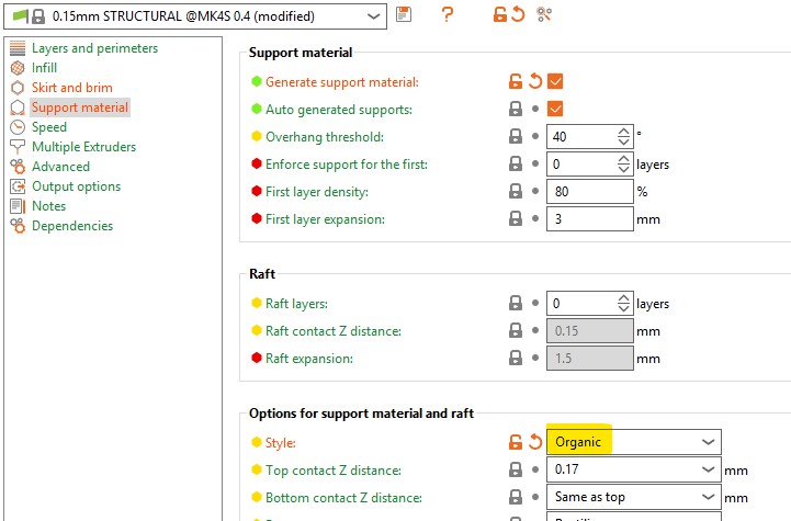 In addition, I tested the supported version by changing the support type. To change this, you have to click in Print Settings > Support Material and toggle "generate support material". Once it's checked, the dropdown for "Style" under "Options for support and raft" should be available. If you do not see it, you have to change the mode in the right hand corner from "Beginner mode" to "Normal" or "Expert".