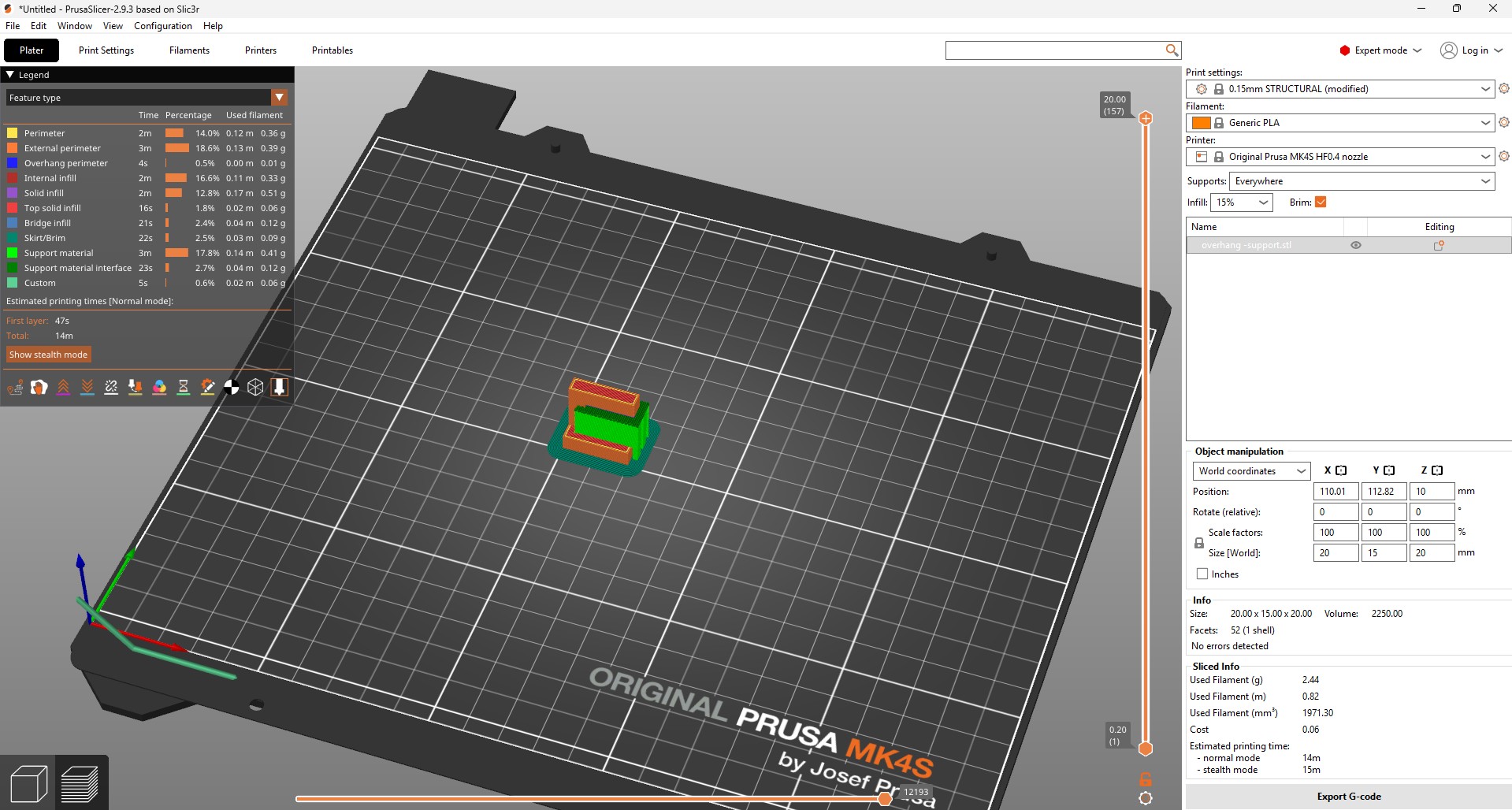 In addition, I tested the supported version by changing the support type. To change this, you have to click in Print Settings > Support Material and toggle "generate support material". Once it's checked, the dropdown for "Style" under "Options for support and raft" should be available. If you do not see it, you have to change the mode in the right hand corner from "Beginner mode" to "Normal" or "Expert". Grid makes a column with straight lines going back and forth that go even beyond the area in overhang. Snug makes the same but it fits exactly the overhang area. Organic makes tree-like structures that take less material and are easier to remove, leaving behind less residue.
