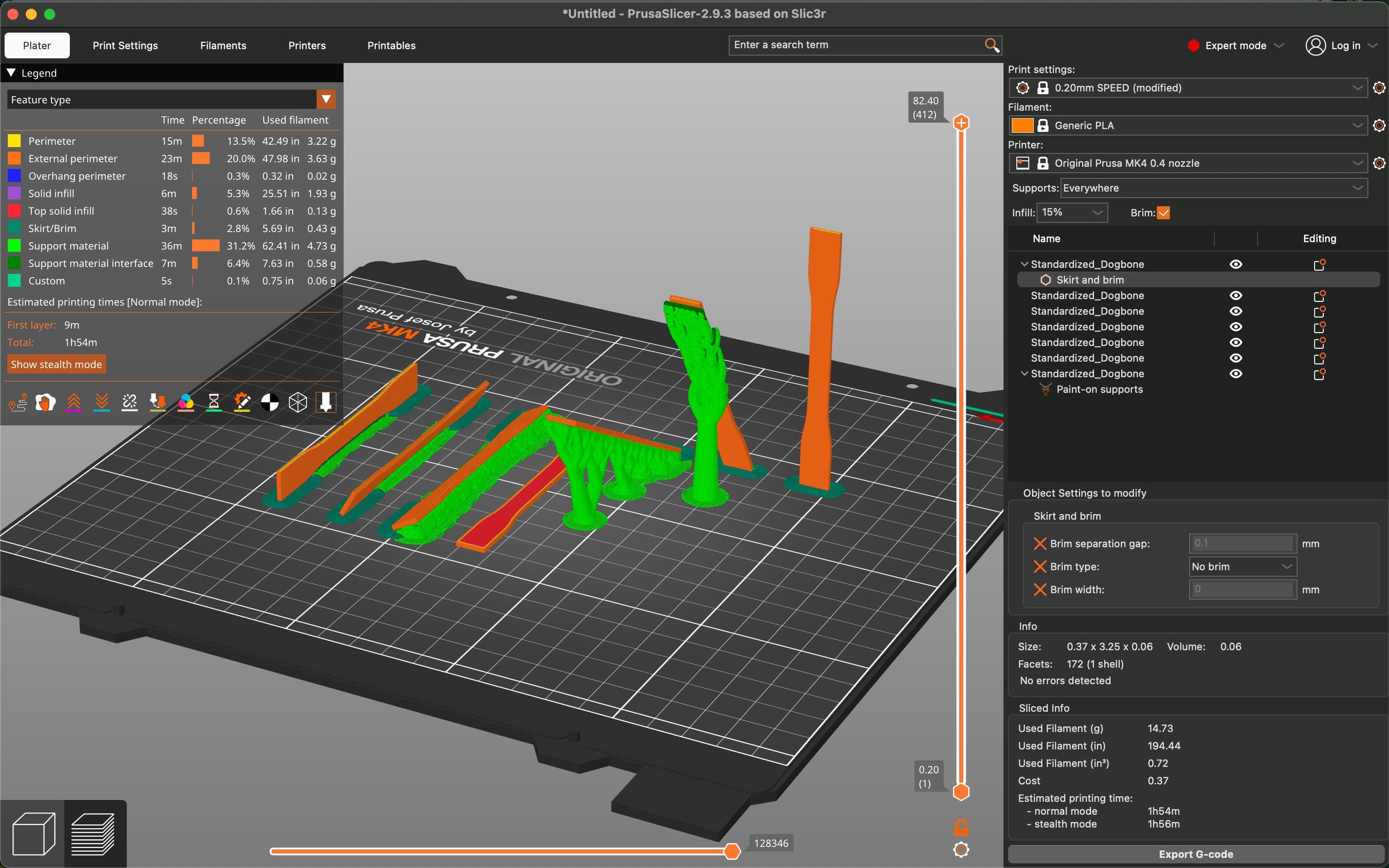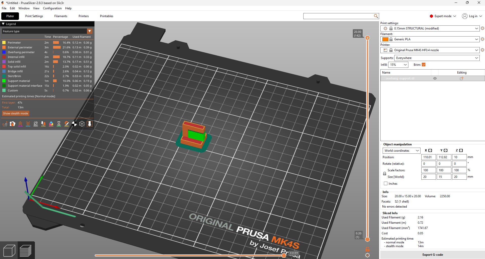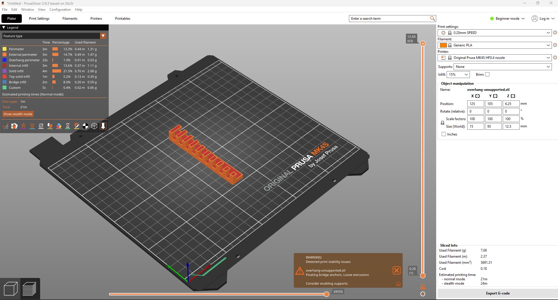 I worked on the overhang for supported and unsupported files. I used the Prusa MK4S printers with 1.75 PLA filament. The settings were left in default for the unsupported version: 0.20mm SPEED, generic PLA, HF0.4 nozzle, and 15% infill. In this test, you can see how short overhang might work with no support for very short distances, under 3mm.