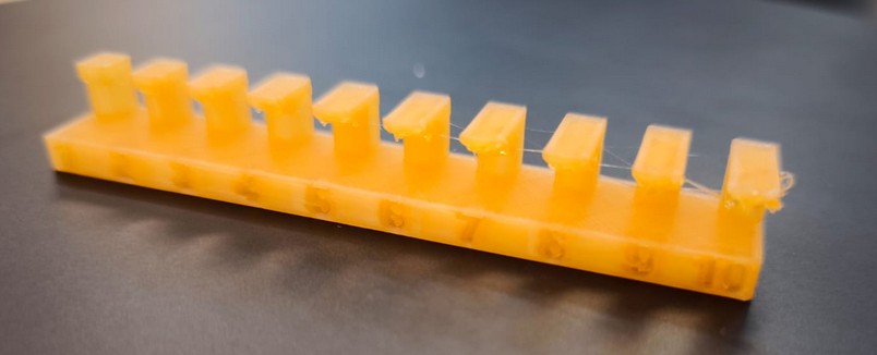 To test bridge support performance, we used this 3D bridge file and printed bridges ranging from 10mm to 70mm. The 30mm bridge was the most stable. Beyond that, the structure started to sag and produce spaghetti.