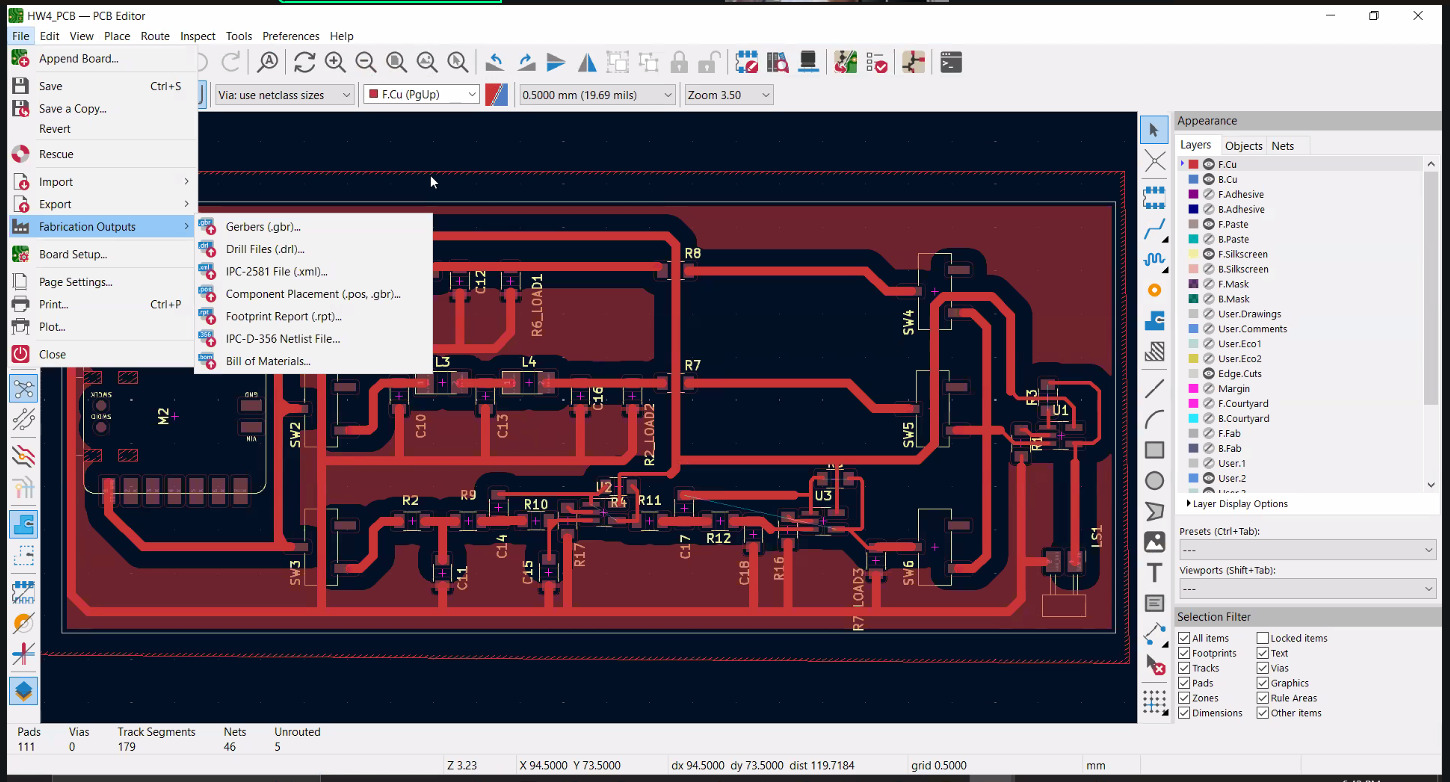 Ben made a board that we used as an example. He had experience with the export and submission process and taught the rest of us. See his board below! We exported the files through the File > Fabrication Outputs > Gerbers menu option.