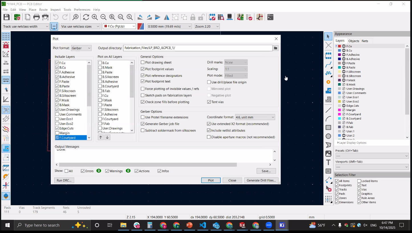 We selected the layers that we wanted to export in the dialog that pops up. Note that we need to export some layers like the Silkscreen that isn't needed for the in-house fabrication process on the Carvera. JLCPCB is able to use that layer to print component IDs onto the board.