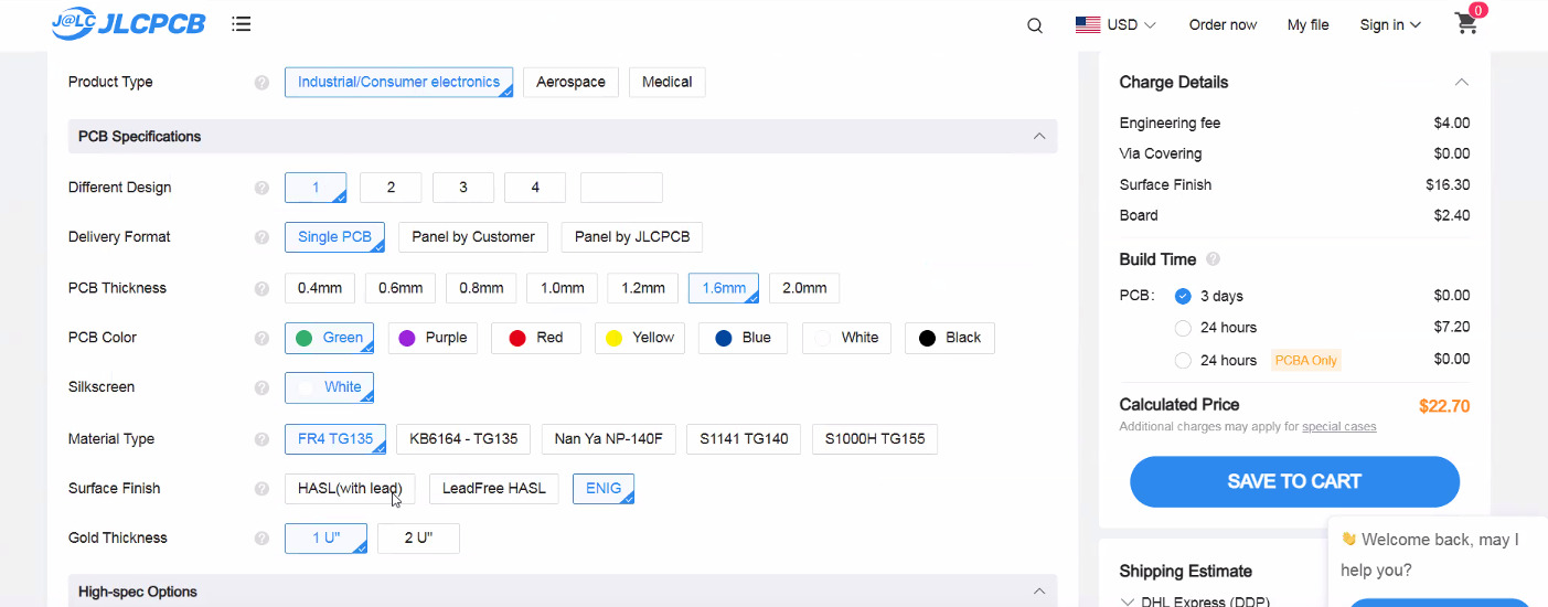 We were curious about the pricing and played with the different configuration options. Opting for the ENIG surface finish increases pricing from ~$6 to ~$22. Similarly, going for the purple color adds a surcharge putting us above $40 for the fabricated boards.