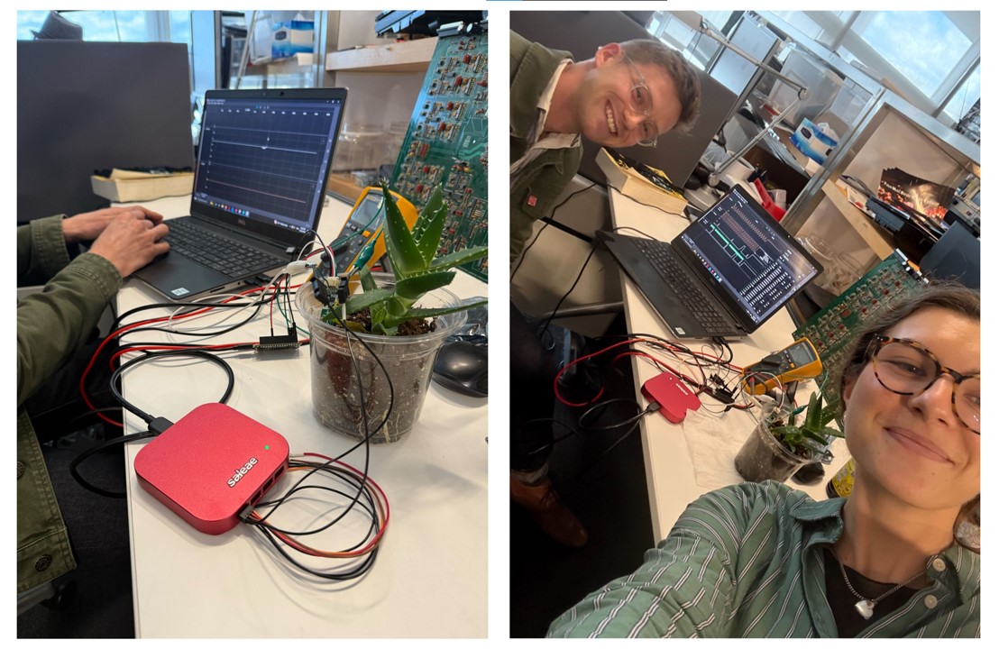 He showed me with the Saleae logic analyzer how a very simple I2C protocol he was running between a capacitive sensor for soil moisture dectection and a RP2040. I observed the three lines: clock, data, and ground. Ben explained that they do a sort of choreographed handshake and then dance in order to maintain the reliability of data transfer. First there is a SYN / ACK exchange to indicate that data is about to be sent. Then, the clock line pulses low / high while the data line sends bits. When the clock line returns to 1, there is no more data to be sent.