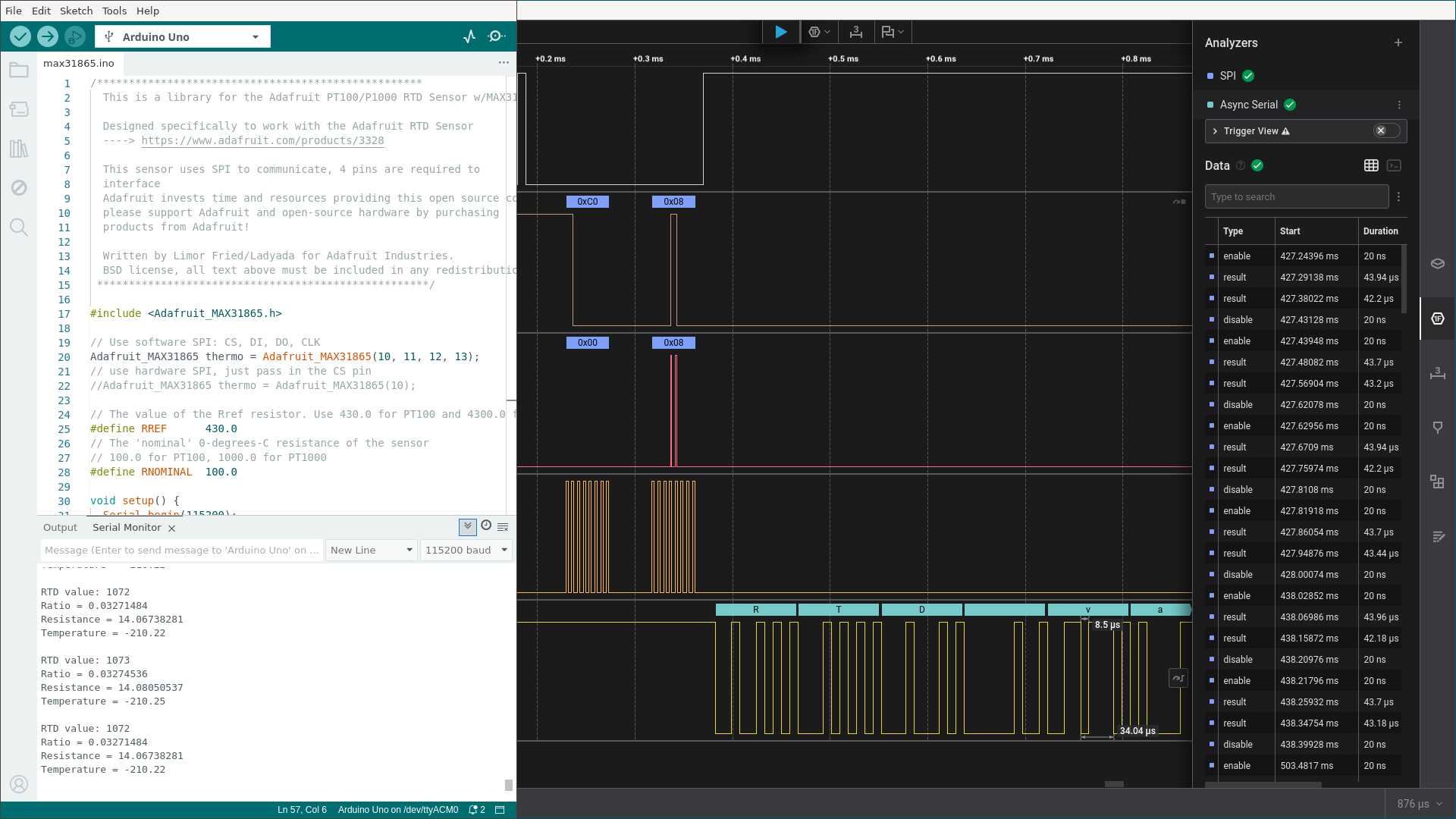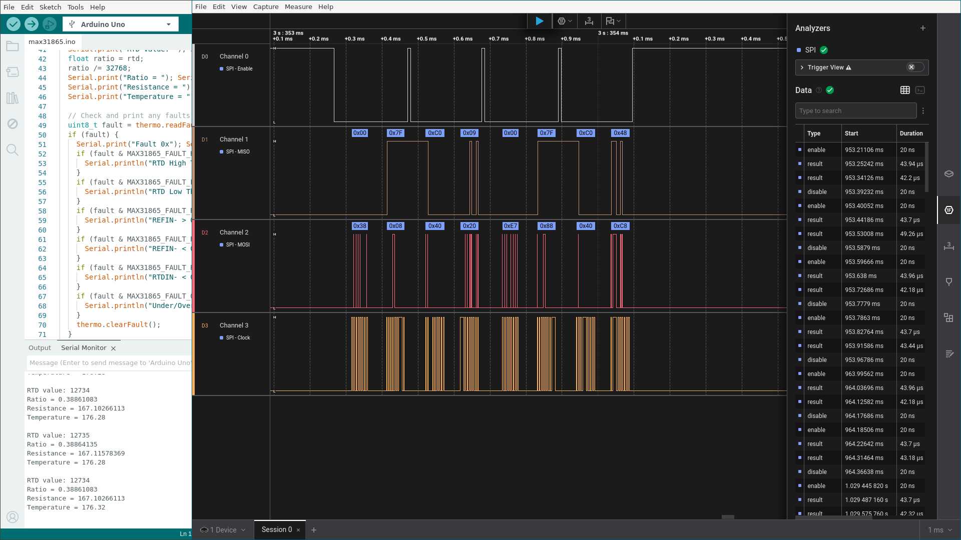- Channel 1 = MISO. The line the Arduino uses to receive data from the thermocouple (it reads only, doesn’t write).