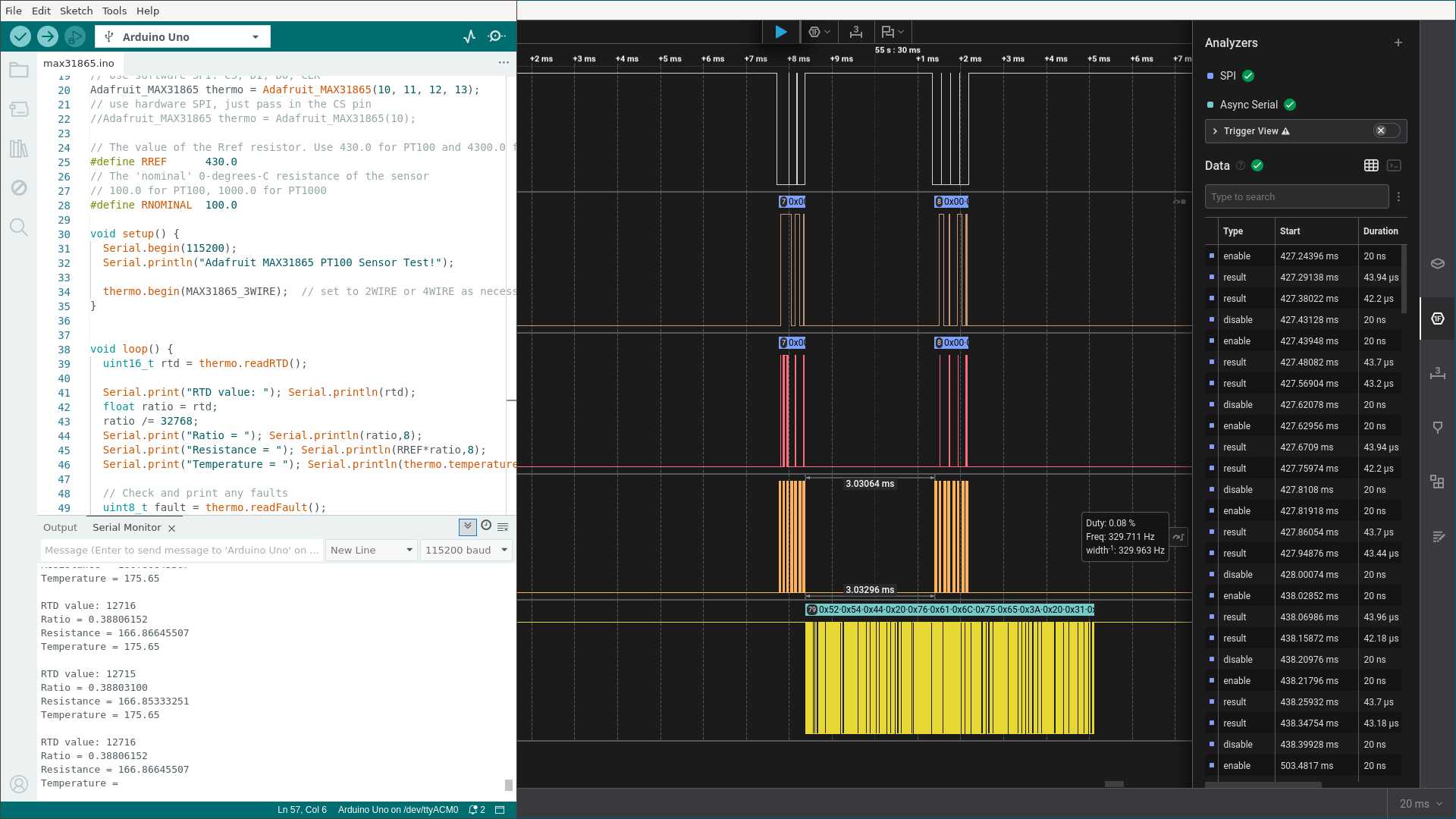- Channel 3 = Clock. This line pulses consistently while communication is happening. The thermocouple can’t trigger communication—it only responds while the manager’s clock is active.